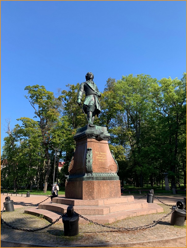 На набережной, возвышается бронзовая фигура Петра Первого, смотрящего на морскую гладь.